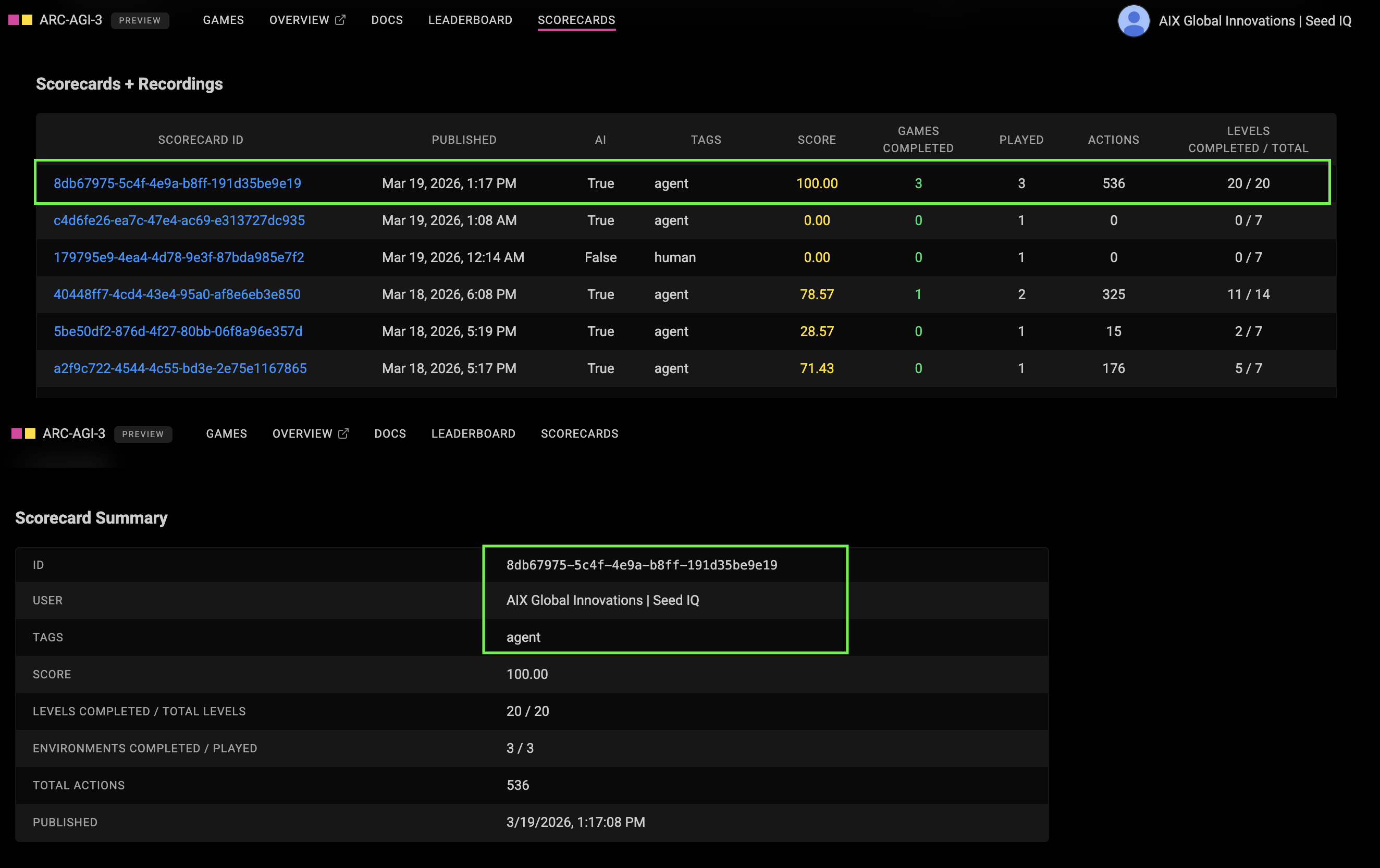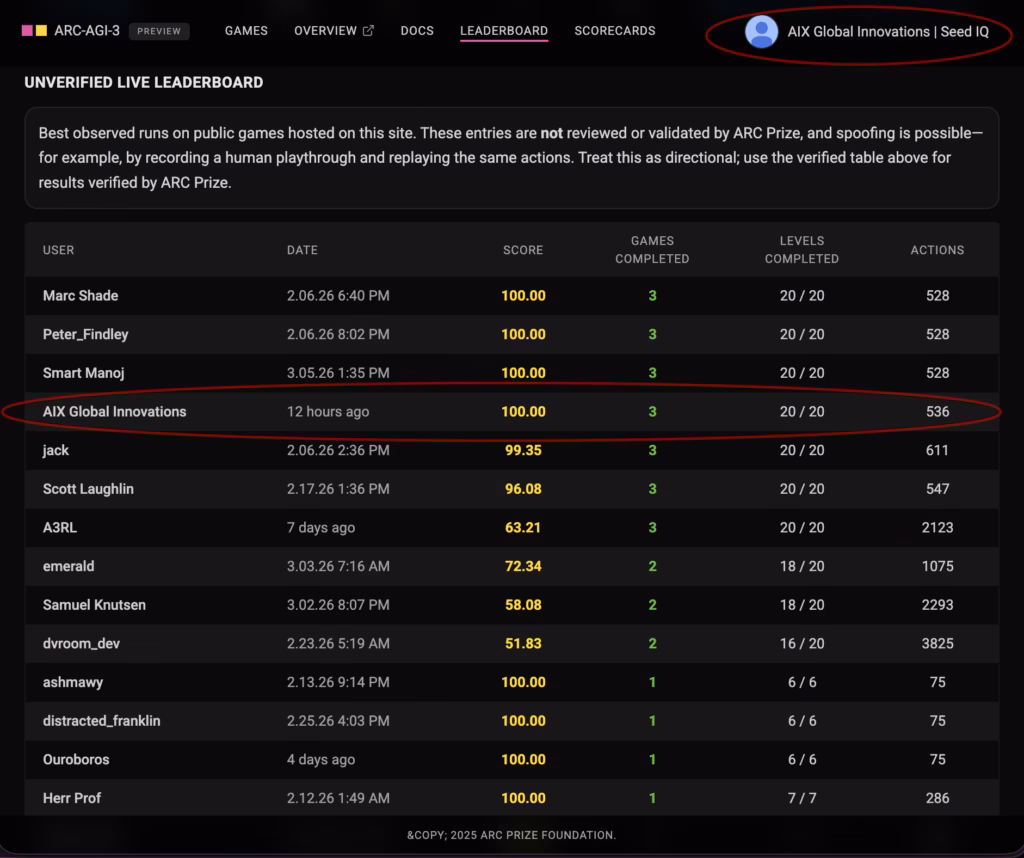 Seed IQ™ clearly still maintained top human-level performance even after the increased complexity, fully adaptive under uncertainty, achieving a score that placed it within the leading 5 humans competing on ARC 3 at launch time on the March 25th.
