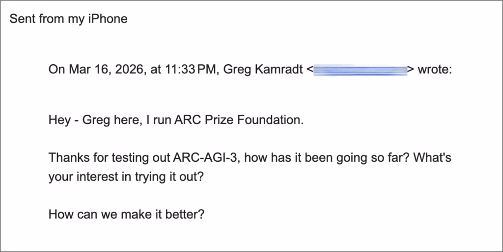 On March 16, Greg Kamradt from the ARC Prize Foundation emailed Denis directly.