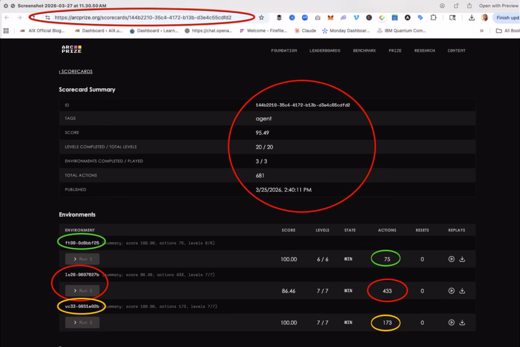 My Co-Founder and Chief Innovations Officer, Denis O, started playing around with the ARC 3 developer toolkit on March 13th, connecting our Seed IQ™ — the first Active Inference autonomy engine, an agent architecture for adaptive multi agent autonomous control over complex systems. (Prior to the official ARC-AGI 3 launch last Wednesday, there were 3 games available to play: LS20, VC33, and FT09.)