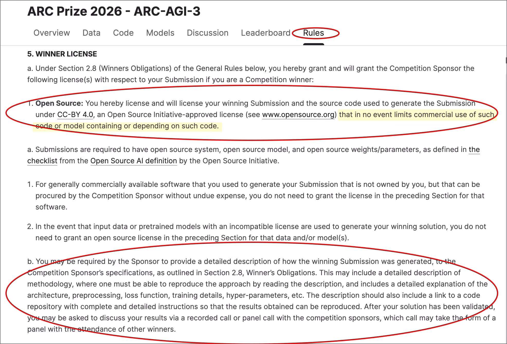 One of the ARC Prize founders, François Chollet, has recently raised $40M+ as a co-founder of an AI lab, Ndea, focused on Artificial General Intelligence (AGI). At the same time, ARC-AGI 3 is positioning itself as a pinnacle central benchmark in the AI industry with a purported mission to evaluate the most advanced AI systems — while requiring participants to submit their full codebases, methodologies, and implementation details under terms that allow for reuse and commercialization.
