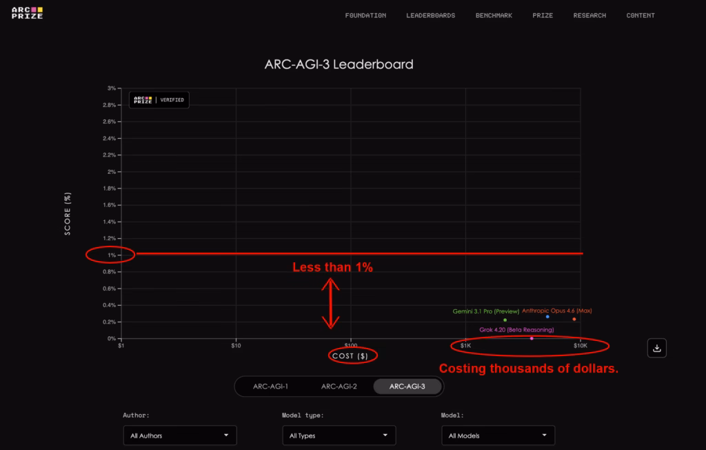 For much of the deep learning community, this is not a barrier. These systems are all built on the same foundation models and open frameworks. If this benchmark is highlighting anything, it is that DL systems have no moat. And not surprisingly, they are all performing more or less equally on ARC 3 — essentially at zero.